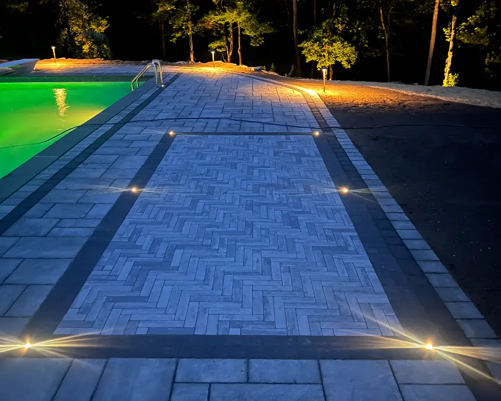 We used a mix of high-end materials from Techo-Bloc, Nicolock, and Unique Lighting Systems, chosen to deliver both function and flair.